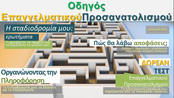 Με σκοπό την υποστήριξη των μαθητών/τριών της Γ΄ λυκείου των σχολείων μας, αλλά και της ευρύτερης κοινότητας, στις πρωτόγνωρες συνθήκες που βιώνει η χώρα μας, οι ειδικοί στην Συμβουλευτική Επαγγελματικού Προσανατολισμού του 2ου ΚΕΣΥ Αθήνας, δημιούργησαν έναν σύντομο «Οδηγό Επαγγελματικού Προσανατολισμού».