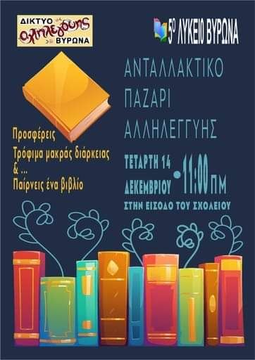 Στον χώρο του σχολείου μας θα γίνει την Τετάρτη 14/12/2022 στις 11.00 πμ ανταλλακτικό παζάρι, όπου εμείς θα προσφέρουμε τρόφιμα για να μοιραστούν σε οικογένειες του δήμου μας οι οποίες αντιμετωπίζουν οικονομικές δυσκολίες, και σε αντάλλαγμα θα μας προσφερθούν βιβλία.