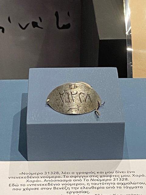 Σίγουρα το αντικείμενο που κέντρισε την προσοχή όλων μας ήταν το ντενεκεδένιο νούμερο 31328 (με αραβικά ψηφία) που χάρισε στον Βενέζη την ελευθερία από τα τάγματα εργασίας των Τούρκων.