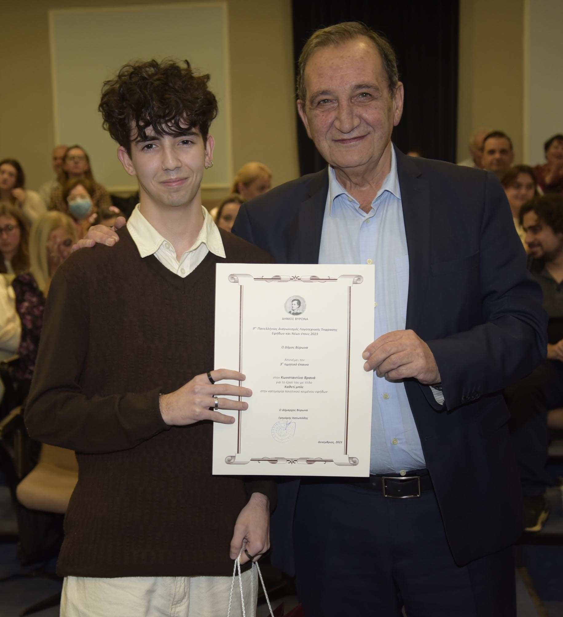 Με χαρά και υπερηφάνεια ανακοινώνουμε ότι την Πέμπτη 28 Δεκεμβρίου 2023 ο Δήμος Βύρωνα βράβευσε σε μία ζεστή εκδήλωση που έγινε στο αμφιθέατρο "Αντώνης Τρίτσης" του Πνευματικού Κέντρου του Δήμου Αθηναίων: