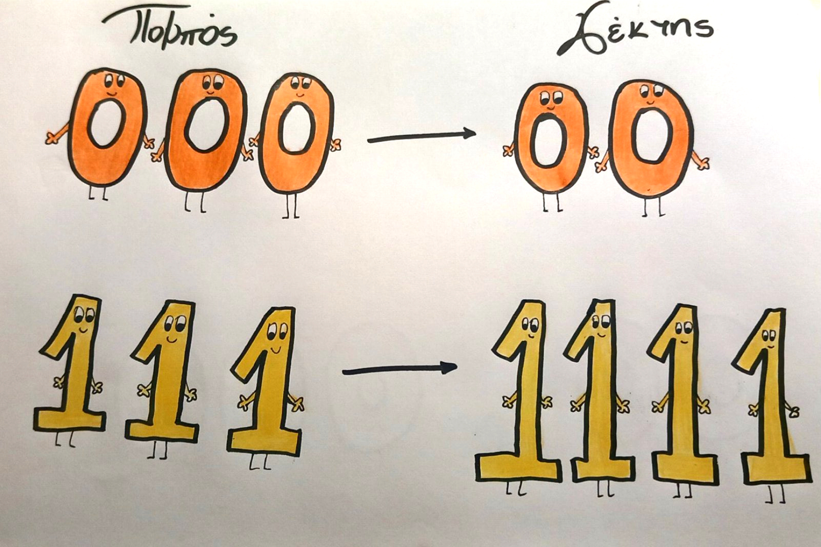 Δεν έχει τρόπο να μάθει ότι το δικό του ρολόι πάει ας πούμε λίγο μπροστά ή λίγο πίσω! Οπότε η κατάσταση σύντομα γίνεται χαοτική! Είναι σαν ο δέκτης να μην βλέπει καθαρά, ιδίως όταν το μήνυμα έχει πολλά συνεχόμενα ίδια bit. Φτάνουν ας πούμε 3 συνεχόμενα μηδέν και ο δέκτης νομίζει ότι έφτασαν 2. Φτάνουν ας πούμε 4 συνεχόμενα ένα και ο δέκτης νομίζει ότι έφτασαν 5.